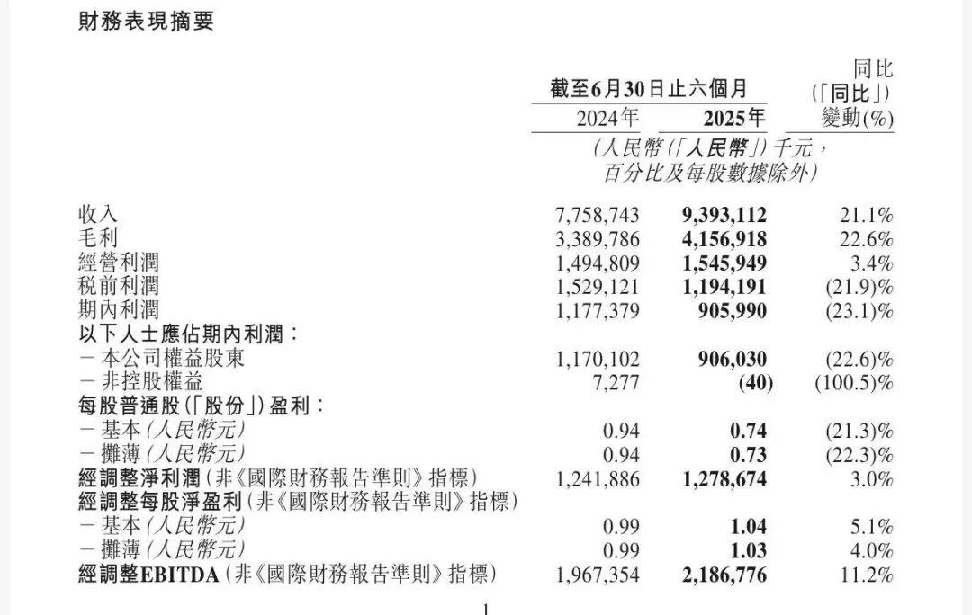 名创优品2025年中报显示:上半年收入93.93亿元,同比增长21.1%;经营利润15.46亿元,同比微增3.4%。