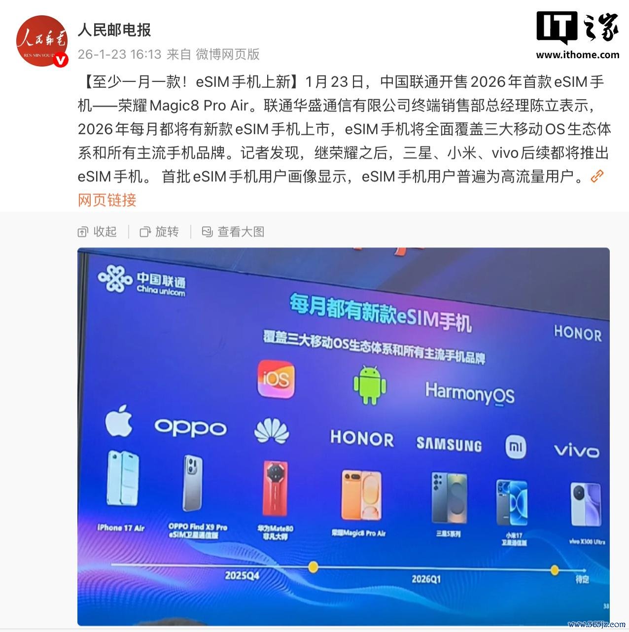 IT之家1月24日消息,据工信部《人民邮电报》报道,1月23日,联通华盛通信有限公司终端销售部总经理陈立表示,2026年每月都将有新款eSIM手机上市,至少一月一款普患配资,eSIM 手机将全面覆盖三大移动 OS 生态体系和所有主流手机品牌。